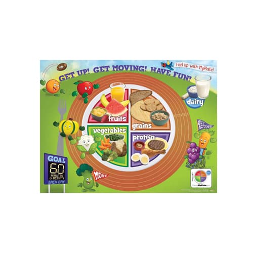 Teachers can inspire their students to stay active with the Active Kids MyPlate Poster. Prominent fruit and vegetable heroes border this fun, sports-themed poster, encouraging children to clock in their 60 minutes of daily physical activity. Kids will also be able to visualize what the portion sizes of food on their own plate should look like thanks to the central MyPlate graphic that depicts and labels the major food groups. With the colorful design, this poster is great for placement in lunchrooms, P.E. classes and health classes.