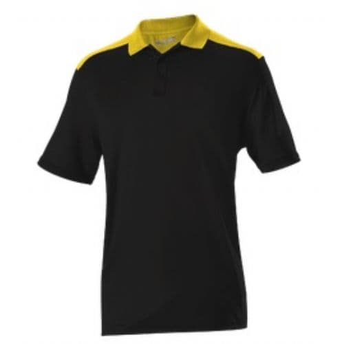 Alleson Adult Color Block Gameday Polo 95% Cationic Polyester/5% Spandex. Basic color block polo with set-in sleeves. Solid body with contrast color front and back yoke and rib knit collar. Back yoke seam for appearance and comfort. Straight hemmed bottom and sleeve ends. Self-material body, 3-button placket. Tagless labeling for added comfort.