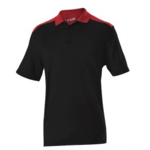 Alleson Adult Color Block Gameday Polo 95% Cationic Polyester/5% Spandex. Basic color block polo with set-in sleeves. Solid body with contrast color front and back yoke and rib knit collar. Back yoke seam for appearance and comfort. Straight hemmed bottom and sleeve ends. Self-material body, 3-button placket. Tagless labeling for added comfort.