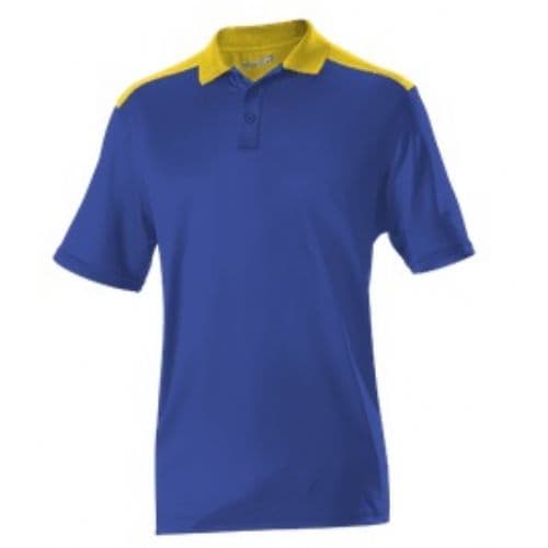Alleson Adult Color Block Gameday Polo 95% Cationic Polyester/5% Spandex. Basic color block polo with set-in sleeves. Solid body with contrast color front and back yoke and rib knit collar. Back yoke seam for appearance and comfort. Straight hemmed bottom and sleeve ends. Self-material body, 3-button placket. Tagless labeling for added comfort.