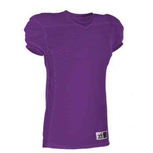 Alleson Elusive Football Jersey Adult 100% eXtreme mesh cationic polyester 100 denier tricot mesh with moisture management finish body and sleeves.  100% eXtreme DAZZLE cationic polyester with moisture management finish yoke.  85% polyester/15% spandex side inserts, v-neck and sleeve cuffs.  Full length elusive cut jersey with straight lycra side inserts.  Double thickness DAZZLE traditional yoke with tricot mesh body and sleeves.  Lycra set-in mitered v-neck and sleeve cuff with elastic.  Two color jerseys have contrast color side inserts, sleeve cuffs and v-neck.  Cover seamed throughout for additional strength.