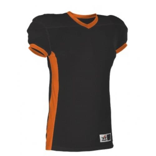 Alleson Elusive Football Jersey Adult 100% eXtreme mesh cationic polyester 100 denier tricot mesh with moisture management finish body and sleeves.  100% eXtreme DAZZLE cationic polyester with moisture management finish yoke.  85% polyester/15% spandex side inserts, v-neck and sleeve cuffs.  Full length elusive cut jersey with straight lycra side inserts.  Double thickness DAZZLE traditional yoke with tricot mesh body and sleeves.  Lycra set-in mitered v-neck and sleeve cuff with elastic.  Two color jerseys have contrast color side inserts, sleeve cuffs and v-neck.  Cover seamed throughout for additional strength.