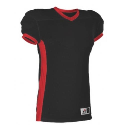 Alleson Elusive Football Jersey Adult 100% eXtreme mesh cationic polyester 100 denier tricot mesh with moisture management finish body and sleeves.  100% eXtreme DAZZLE cationic polyester with moisture management finish yoke.  85% polyester/15% spandex side inserts, v-neck and sleeve cuffs.  Full length elusive cut jersey with straight lycra side inserts.  Double thickness DAZZLE traditional yoke with tricot mesh body and sleeves.  Lycra set-in mitered v-neck and sleeve cuff with elastic.  Two color jerseys have contrast color side inserts, sleeve cuffs and v-neck.  Cover seamed throughout for additional strength.
