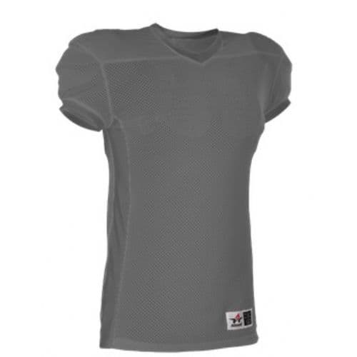 Alleson Elusive Football Jersey Adult 100% eXtreme mesh cationic polyester 100 denier tricot mesh with moisture management finish body and sleeves.  100% eXtreme DAZZLE cationic polyester with moisture management finish yoke.  85% polyester/15% spandex side inserts, v-neck and sleeve cuffs.  Full length elusive cut jersey with straight lycra side inserts.  Double thickness DAZZLE traditional yoke with tricot mesh body and sleeves.  Lycra set-in mitered v-neck and sleeve cuff with elastic.  Two color jerseys have contrast color side inserts, sleeve cuffs and v-neck.  Cover seamed throughout for additional strength.
