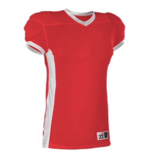 Alleson Elusive Football Jersey Adult 100% eXtreme mesh cationic polyester 100 denier tricot mesh with moisture management finish body and sleeves.  100% eXtreme DAZZLE cationic polyester with moisture management finish yoke.  85% polyester/15% spandex side inserts, v-neck and sleeve cuffs.  Full length elusive cut jersey with straight lycra side inserts.  Double thickness DAZZLE traditional yoke with tricot mesh body and sleeves.  Lycra set-in mitered v-neck and sleeve cuff with elastic.  Two color jerseys have contrast color side inserts, sleeve cuffs and v-neck.  Cover seamed throughout for additional strength.