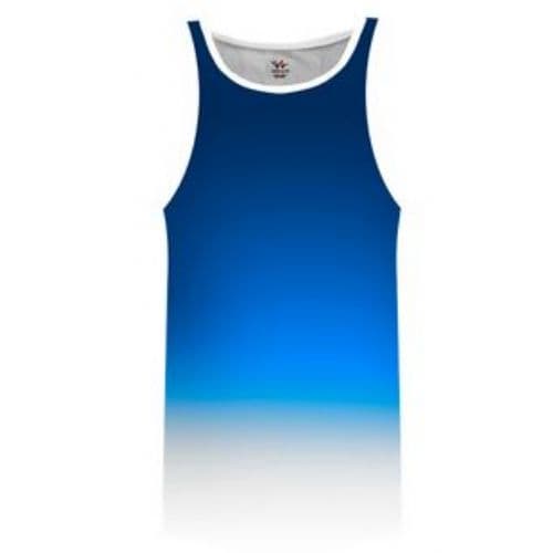 Alleson Youth Ombre Track Singlet 100% Polyester moisture management/antimicrobial performance fabric. Single ply tank body. Ombre color body coming from top of singlet cascading down to white to the bottom. White self-material trim around armholes. Straight cover hemmed bottom.