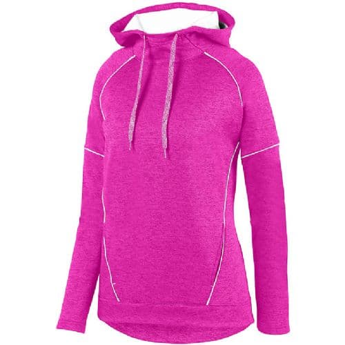 Augusta Ladies' Zoe Tonal Heather Hoody 100% Polyester tonal performance wicking fleece. 100% Polyester performance wicking fleece solid contrast color piping detail. 100% Polyester mesh hood lining. Wicks moisture. Ladies' fit. Pad print label. Scuba shaped 3 piece hood with contrast color mesh lining and heathered tipped drawcord on sizes M-2XL only. Raglan sleeves. Front pocket with an interior pouch pocket * Self-fabric cuffs and bottom band. Dropped tail. Open bottom.