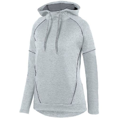 Augusta Ladies' Zoe Tonal Heather Hoody 100% Polyester tonal performance wicking fleece. 100% Polyester performance wicking fleece solid contrast color piping detail. 100% Polyester mesh hood lining. Wicks moisture. Ladies' fit. Pad print label. Scuba shaped 3 piece hood with contrast color mesh lining and heathered tipped drawcord on sizes M-2XL only. Raglan sleeves. Front pocket with an interior pouch pocket * Self-fabric cuffs and bottom band. Dropped tail. Open bottom.