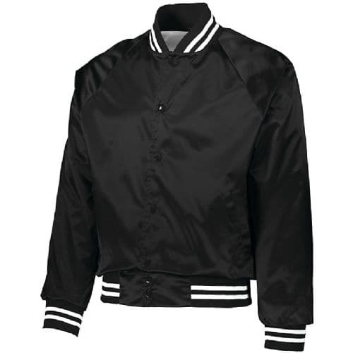 Augusta Satin Baseball Jacket/Striped Trim Outer shell of 100% nylon satin. Lined with 100% polyester brushed tricot. Tear away label. Snap front. Raglan sleeves for maximum mobility. Striped rib-knit collar cuffs and bottom band. Front pockets. Water-resistant.