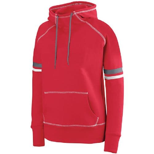 Augusta Women's Spry Hoody 9 Ounce 50% Cotton/50% Polyester smooth athletic fleece. Ladies' fit. Woven label. Scuba shaped hood with contrast color drawcord on sizes M-2XL only. Contrast color three-needle coverstich. Raglan sleeves with contrast color sleeve stripes and thumbholes for warmth. Front pouch pocket. Rib-knit cuffs and bottom band.