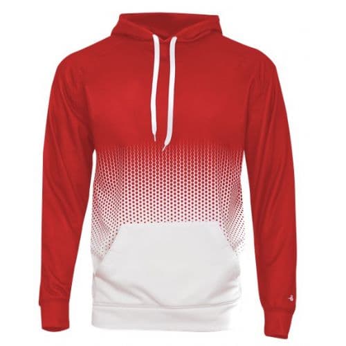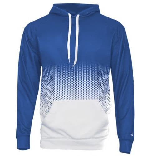 Badger Hex 2.0 Hood 100% Polyester moisture management/antimicrobial performance fabric. Sublimated body and shoulders/sleeves. Front pouch pocket with two hook and loop closures and headset opening. Self-fabric caffs & waistband. Embroidered Badger logo on left sleeve.
