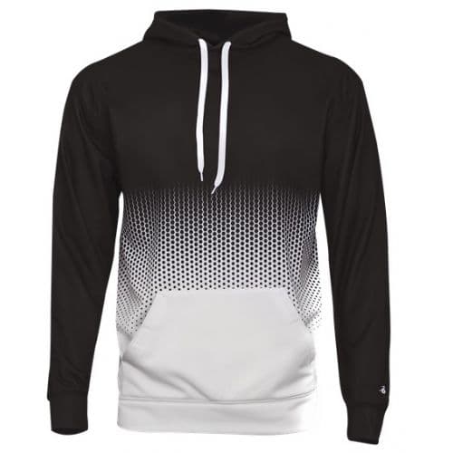 Badger Hex 2.0 Hood 100% Polyester moisture management/antimicrobial performance fabric. Sublimated body and shoulders/sleeves. Front pouch pocket with two hook and loop closures and headset opening. Self-fabric caffs & waistband. Embroidered Badger logo on left sleeve.