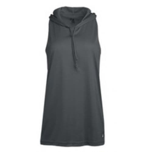 Badger Ladies' B-Core Racerback Hood Tank 100% Polyester moisture management/antimicrobial performance fabric. Self-fabric hood with drawcord. A-line body. Racerback w/ room to print. Badger heat seal logo on lower left front body. Double-needle hem.