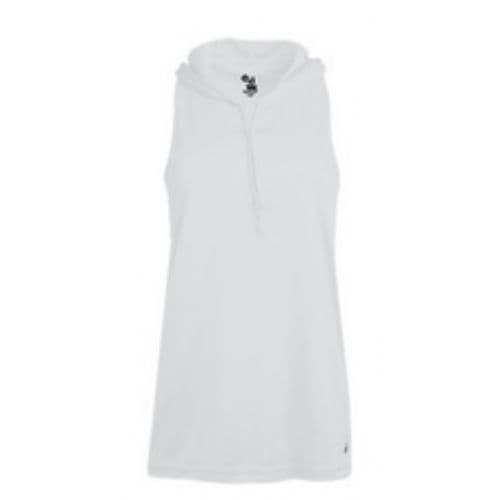 Badger Ladies' B-Core Racerback Hood Tank 100% Polyester moisture management/antimicrobial performance fabric. Self-fabric hood with drawcord. A-line body. Racerback w/ room to print. Badger heat seal logo on lower left front body. Double-needle hem.
