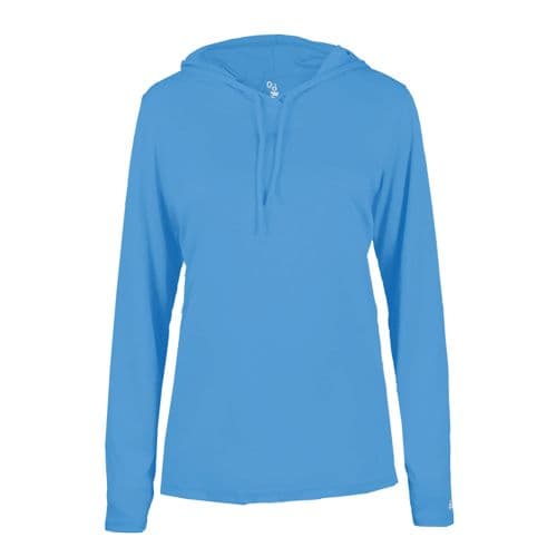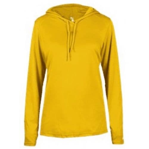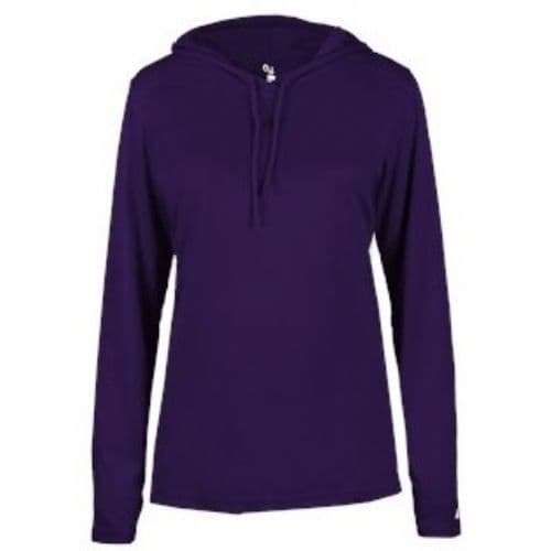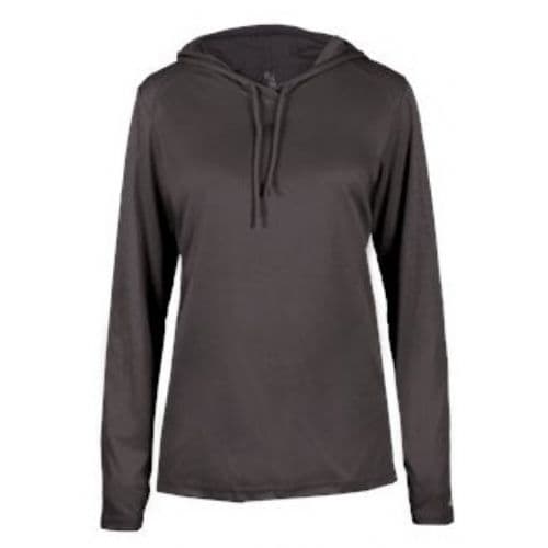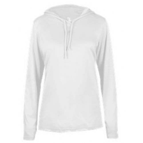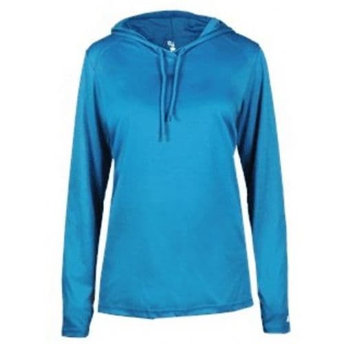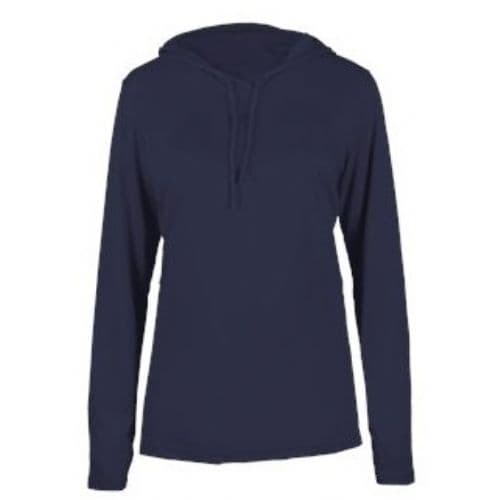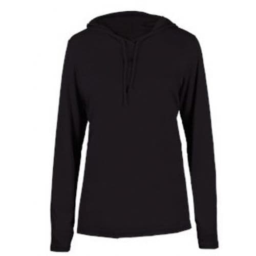 Rough weather won't stop athletes from achieving their fitness goals when they wear this Badger Women's B-Core Long-Sleeve V-Neck Hooded T-Shirt. Wearers can stay dry, fresh and comfortable during early-morning jogs or evening team practices thanks to the moisture-management, antimicrobial fabric, which helps keep perspiration and odors in check. Players will be able to perform efficiently in inclement conditions, since the attached hood features a drawstring to effectively keep out the elements.