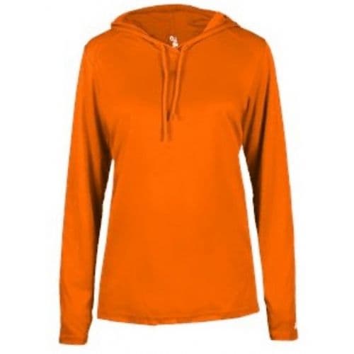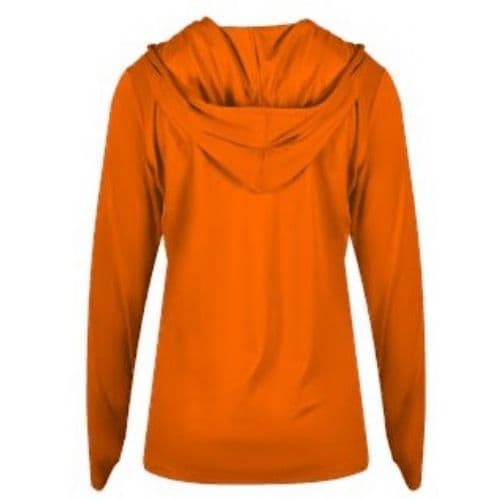Rough weather won't stop athletes from achieving their fitness goals when they wear this Badger Women's B-Core Long-Sleeve V-Neck Hooded T-Shirt. Wearers can stay dry, fresh and comfortable during early-morning jogs or evening team practices thanks to the moisture-management, antimicrobial fabric, which helps keep perspiration and odors in check. Players will be able to perform efficiently in inclement conditions, since the attached hood features a drawstring to effectively keep out the elements.