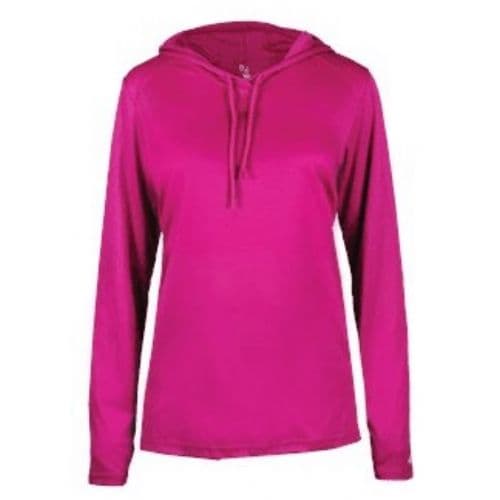 Rough weather won't stop athletes from achieving their fitness goals when they wear this Badger Women's B-Core Long-Sleeve V-Neck Hooded T-Shirt. Wearers can stay dry, fresh and comfortable during early-morning jogs or evening team practices thanks to the moisture-management, antimicrobial fabric, which helps keep perspiration and odors in check. Players will be able to perform efficiently in inclement conditions, since the attached hood features a drawstring to effectively keep out the elements.