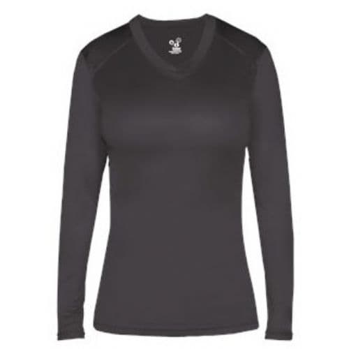 Badger Ladies Ultimate LS V-Neck Tee May be branded Alleson Athletic on the inside - all other aspects of the product will remain the same. Self-fabric collar. Contour silhouette. Badger sport paneled shoulder for maximum movement. Double-needle droptail hem. Superior interlock fabric for comfort. 100% Soft polyester moisture management/antimicrobial performance fabric. UPF 50+ sun protection from UVA and UVB.
