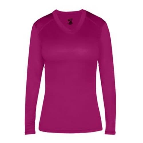 Badger Ladies Ultimate LS V-Neck Tee May be branded Alleson Athletic on the inside - all other aspects of the product will remain the same. Self-fabric collar. Contour silhouette. Badger sport paneled shoulder for maximum movement. Double-needle droptail hem. Superior interlock fabric for comfort. 100% Soft polyester moisture management/antimicrobial performance fabric. UPF 50+ sun protection from UVA and UVB.