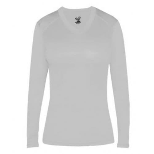 Badger Ladies Ultimate LS V-Neck Tee May be branded Alleson Athletic on the inside - all other aspects of the product will remain the same. Self-fabric collar. Contour silhouette. Badger sport paneled shoulder for maximum movement. Double-needle droptail hem. Superior interlock fabric for comfort. 100% Soft polyester moisture management/antimicrobial performance fabric. UPF 50+ sun protection from UVA and UVB.