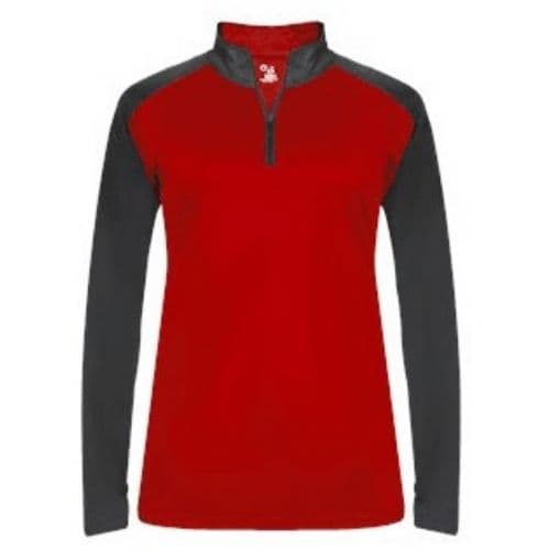 Badger Ladies Ultimate Sport 1/4 Zip 100% Soft Polyester Moisture Management/Antimicrobial Performance Fabric. UVA and UVB sun protection in areas covered by the shirt (UPF 50+). Super soft interlock fabric for comfort. Self-fabric collar with 7" locking zipper. Double-needle hemmed bottom. Badger heat seal logo on left sleeve.