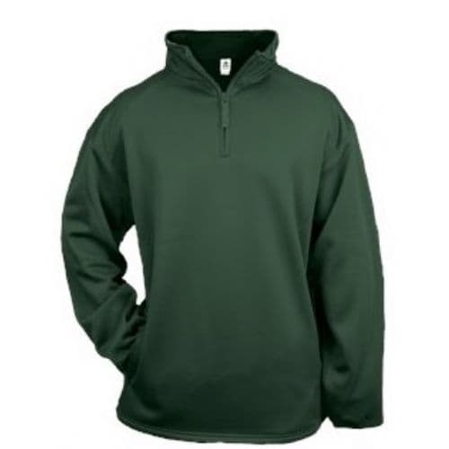Badger Men's 1/4 Zip Performance Pullover 100% Polyester Moisture Management Fabric. 1/4-Zip front with self fabric collar. 2-Front pockets with headset opening. Open bottom. Cuffs feature smooth hem front with rib on back half. Embroidered Badger logo on left sleeve.