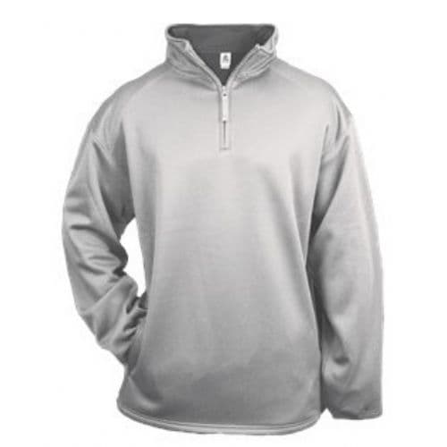 Badger Men's 1/4 Zip Performance Pullover 100% Polyester Moisture Management Fabric. 1/4-Zip front with self fabric collar. 2-Front pockets with headset opening. Open bottom. Cuffs feature smooth hem front with rib on back half. Embroidered Badger logo on left sleeve.