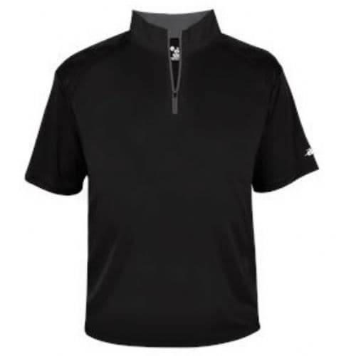 Badger Men's B-Core Short Sleeve 1/4 Zip 100% Polyester Moisture Management fabric. Self-fabric collar with 7" locking zipper. Contrast zipper and inner collar. Badger sport shoulder for maximum movement with cover stitch. Double-needle hemmed bottom. Badger Heat seal logo on left sleeve.