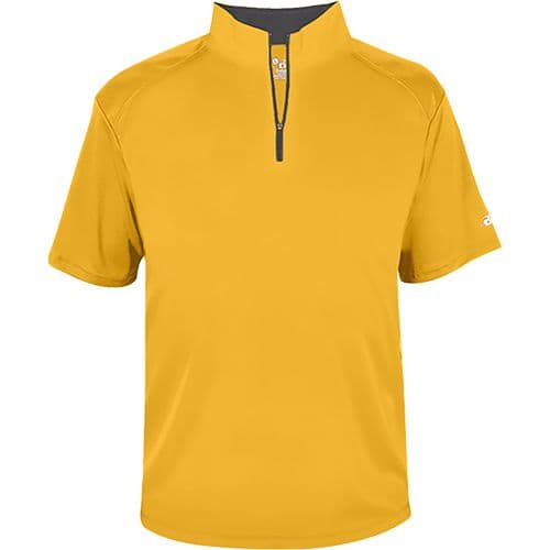 Badger Men's B-Core Short Sleeve 1/4 Zip 100% Polyester Moisture Management fabric. Self-fabric collar with 7" locking zipper. Contrast zipper and inner collar. Badger sport shoulder for maximum movement with cover stitch. Double-needle hemmed bottom. Badger Heat seal logo on left sleeve.