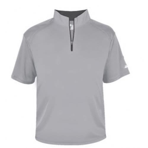 Badger Men's B-Core Short Sleeve 1/4 Zip 100% Polyester Moisture Management fabric. Self-fabric collar with 7" locking zipper. Contrast zipper and inner collar. Badger sport shoulder for maximum movement with cover stitch. Double-needle hemmed bottom. Badger Heat seal logo on left sleeve.