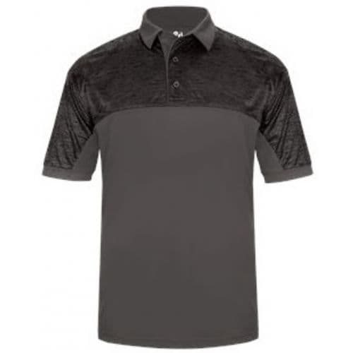 Badger Men's Blend Colorblock Tonal Polo 100% Polyester. Sublimated front and back yoke, sport shoulder and sleeves. Badger Sport shoulder for maximum movement. Solid lower sleeve insert and cuff for contrast detail. Three-button placket. Self-fabric collar. Taped back neck. Vented double-needle hem. Embroidered Badger logo on left sleeve.