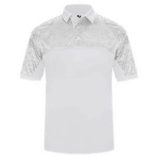 Badger Men's Blend Colorblock Tonal Polo 100% Polyester. Sublimated front and back yoke, sport shoulder and sleeves. Badger Sport shoulder for maximum movement. Solid lower sleeve insert and cuff for contrast detail. Three-button placket. Self-fabric collar. Taped back neck. Vented double-needle hem. Embroidered Badger logo on left sleeve.