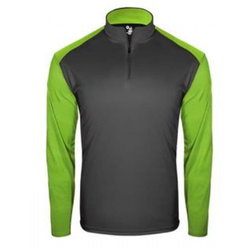 Badger Men's Breakout 1/4 Zip 100% Sublimated Polyester moisture management/ antimicrobial performance fabric. Contrast textured shoulders and sleeves. Self-fabric collar with 8” locking zipper. Badger sport shoulder for maximum movement. Self-fabric collar. Double-needle hem. Badger heat seal logo on left sleeve.