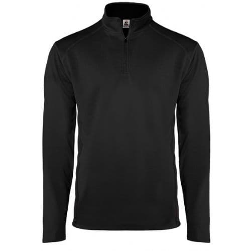 Badger Men's Money Mesh 1/4 Zip 100% Polyester mock mesh moisture management/ antimicrobial performance fabric. Self-fabric collar with 8" locking zipper. Contrast 3-needle coverstitch on sport shoulder armholes and sleeves. Badger sport shoulder for maximum movement. Double-needle hem.