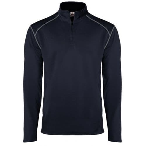Badger Men's Money Mesh 1/4 Zip 100% Polyester mock mesh moisture management/ antimicrobial performance fabric. Self-fabric collar with 8" locking zipper. Contrast 3-needle coverstitch on sport shoulder armholes and sleeves. Badger sport shoulder for maximum movement. Double-needle hem.