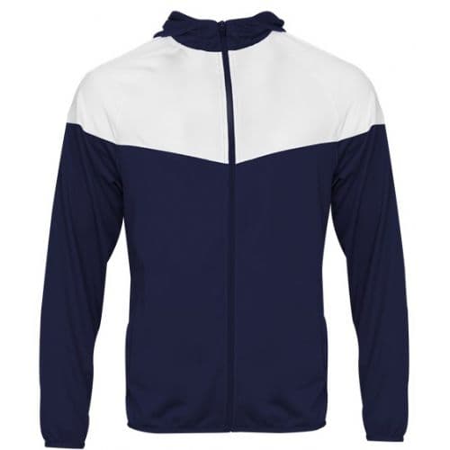 Badger Men's Sprint Outer Core Jacket 100% Polyester fabric. Contrasting inside hood. Front and back yoke and sleeve inserts. Self-fabric hood with drawcord and full length locking zipper. Two front zipper pockets with headset opening. Soft elastic binding on sleeve and bottom hem. Drop tail hem. Badger "B" woven loop label on bottom hem.