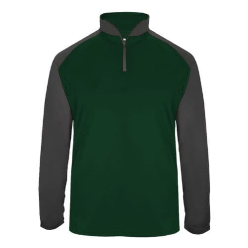 Badger Men's Ultimate Sport 1/4 Zip Badger heat seal logo on left sleeve. Badger sport paneledshoulder for maximum movement. 100% polyester moisture management/antimicrobial performance fabric. Contrast sport shoulder and sleeves. Superior interlock fabric. Doubleneedle hem Self-fabric with 8” locking zipper collar. UPF 50+ sun protection.