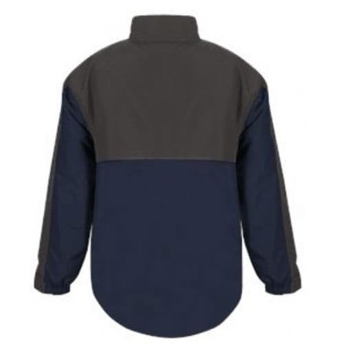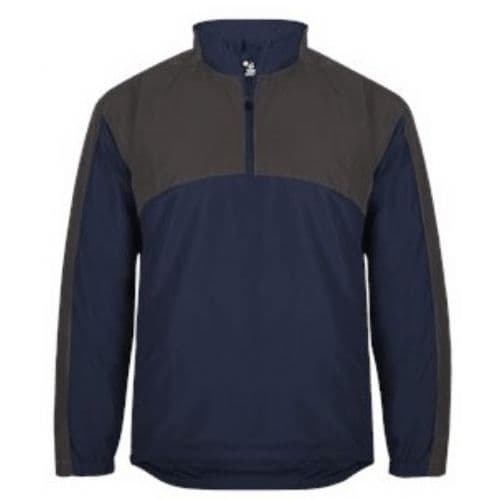 Badger Rip Stop 1/4 Zip 100% Woven Polyester. Arrow mesh body liner. Taffeta sleeve and pocket liner for easy on/off. Wind and water resistant. Badger Sport shoulder for maximum movement. Self-fabric collar with 8" locking zipper. Zipper on left side for easy on/off. Drop Tail hem. Vented back panel with room for decoration. Front zippered zip pockets with headset opening. Bungee cord and hidden toggle on right side seam. Embroidered Badger logo on left sleeve.