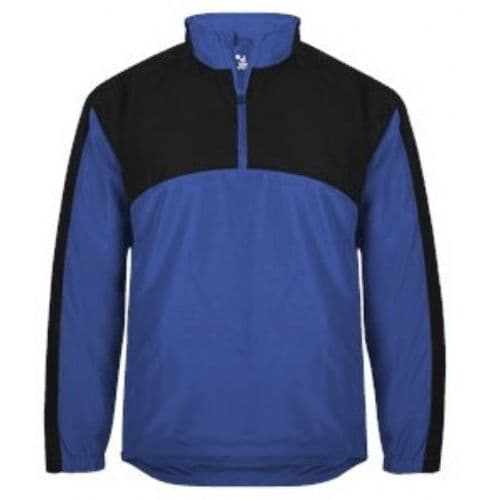 Badger Rip Stop 1/4 Zip 100% Woven Polyester. Arrow mesh body liner. Taffeta sleeve and pocket liner for easy on/off. Wind and water resistant. Badger Sport shoulder for maximum movement. Self-fabric collar with 8" locking zipper. Zipper on left side for easy on/off. Drop Tail hem. Vented back panel with room for decoration. Front zippered zip pockets with headset opening. Bungee cord and hidden toggle on right side seam. Embroidered Badger logo on left sleeve.