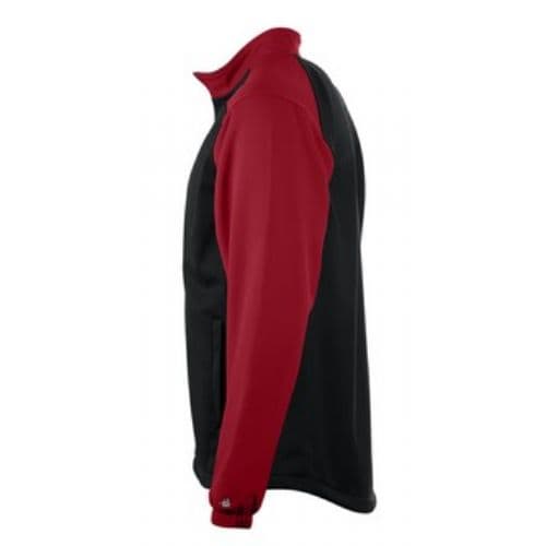 Badger Soft Shell Sport Jacket 90% Polyester/10% Spandex soft shell fabric. Badger sport shoulder for maximum movement. Self-fabric collar with full length locking zipper. Front covered zip pockets with headset opening. Cuffs feature smooth hem front with elastic on back half. Bungee cord and hidden toggle on left side. Drop-tail hem. Embroidered badger logo on left sleeve.