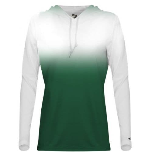Badger Women's Ombre Hood Tee 100% Sublimated Polyester moisture management/ antimicrobial performance fabric. Badger Sport paneled shoulder for maximum movement. Self-fabric collar. Thumbholes in sleeves. Double-needle hem. Badger heat seal logo on left sleeve.