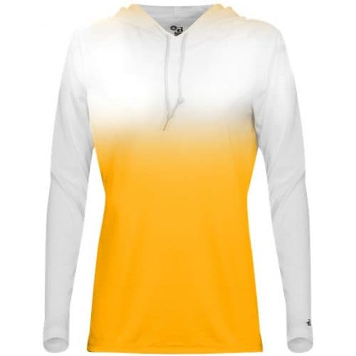 Badger Women's Ombre Hood Tee 100% Sublimated Polyester moisture management/ antimicrobial performance fabric. Badger Sport paneled shoulder for maximum movement. Self-fabric collar. Thumbholes in sleeves. Double-needle hem. Badger heat seal logo on left sleeve.