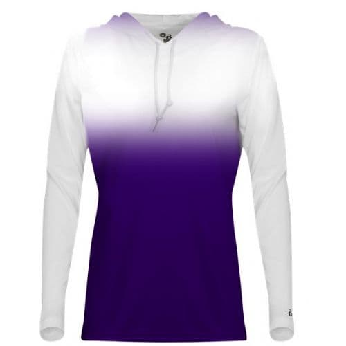 Badger Women's Ombre Hood Tee 100% Sublimated Polyester moisture management/ antimicrobial performance fabric. Badger Sport paneled shoulder for maximum movement. Self-fabric collar. Thumbholes in sleeves. Double-needle hem. Badger heat seal logo on left sleeve.
