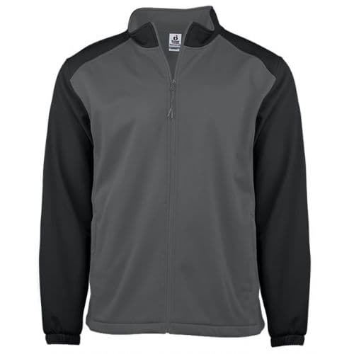 Badger Women's Soft Shell Sport Jacket 90% Polyester/10% Spandex soft shell fabric. Badger sport shoulder for maximum movement. Self-fabric collar with full length locking zipper. Front covered zip pockets with headset opening. Cuffs feature smooth hem front with elastic on back half. Bungee cord and hidden toggle on left side. Embroidered badger logo on left sleeve. Drop-tail hem.