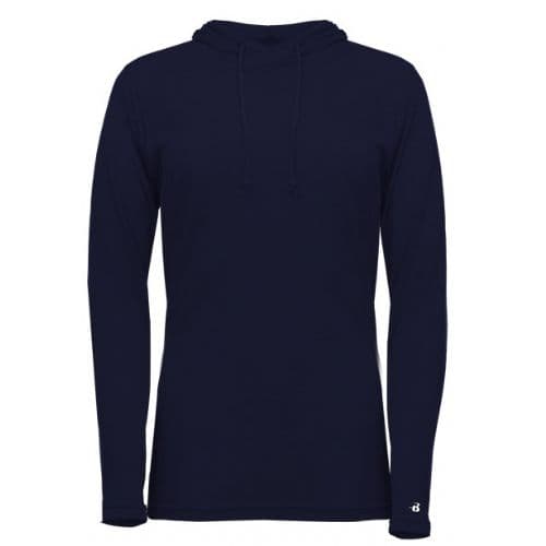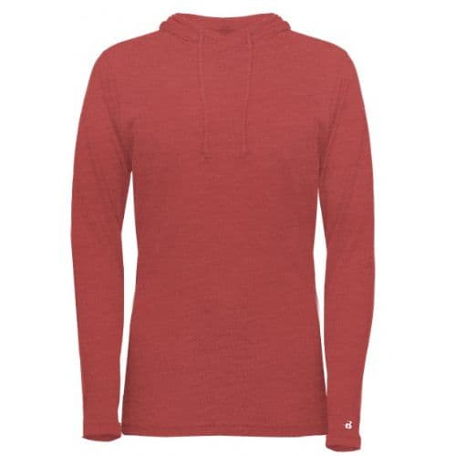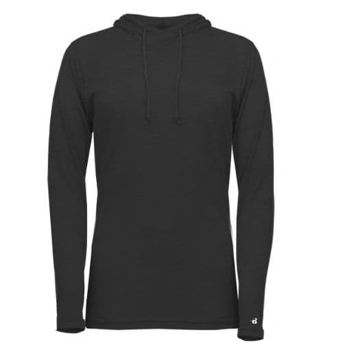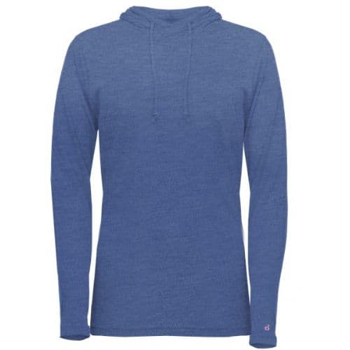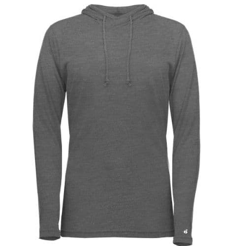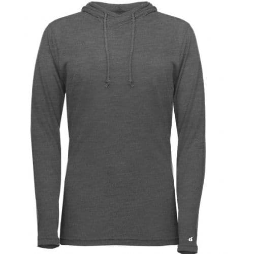 Badger Women's Tri-Blend Surplice Hood Tee 65% Polyester/ 25% Mercerized Cotton/ 10% Rayon moisture management/antimicrobial performance fabric. Badger sport shoulder for maximum movement. Self-fabric surplice hood with drawcord. Thumbholes in sleeves. Double-needle hem. Badger heat seal logo on left sleeve.
