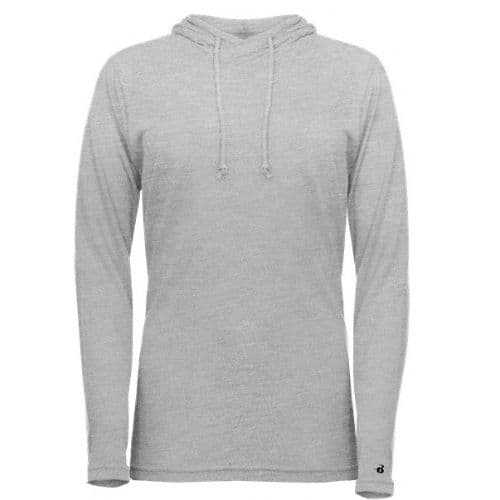 Badger Women's Tri-Blend Surplice Hood Tee 65% Polyester/ 25% Mercerized Cotton/ 10% Rayon moisture management/antimicrobial performance fabric. Badger sport shoulder for maximum movement. Self-fabric surplice hood with drawcord. Thumbholes in sleeves. Double-needle hem. Badger heat seal logo on left sleeve.