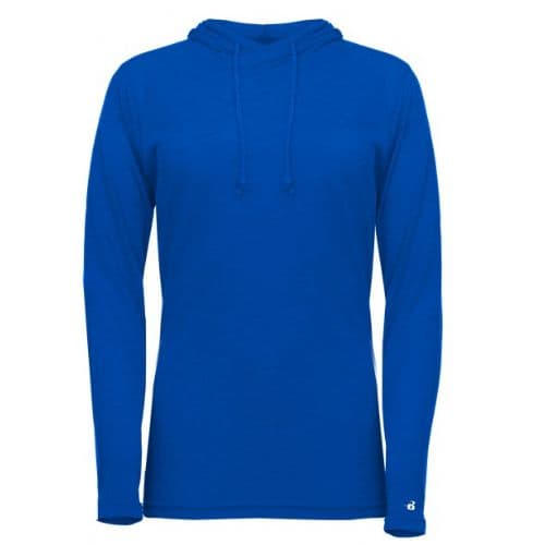 Badger Women's Tri-Blend Surplice Hood Tee 65% Polyester/ 25% Mercerized Cotton/ 10% Rayon moisture management/antimicrobial performance fabric. Badger sport shoulder for maximum movement. Self-fabric surplice hood with drawcord. Thumbholes in sleeves. Double-needle hem. Badger heat seal logo on left sleeve.