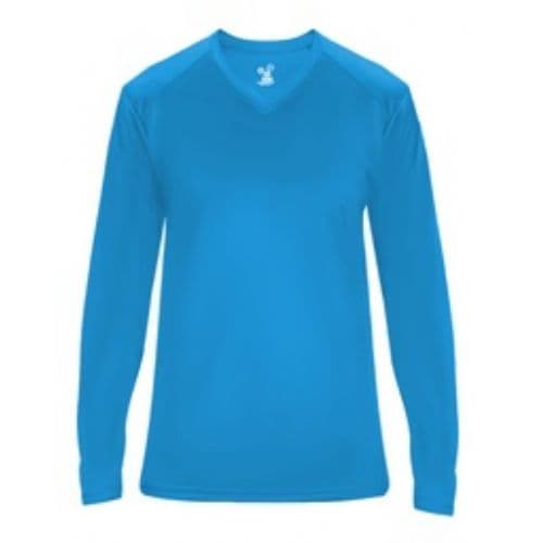 Badger Women's V-Neck L/S Tee 100% Soft Polyester Moisture Management/Antimicrobial Performance Fabric. UVA and UVB sun protection in areas covered by the shirt (UPF 50+). Superior interlock fabric for comfort. Self-fabric collar. Badger sport paneled shoulder. Double-needle hem with tack. Badger heat seal logo on left sleeve.