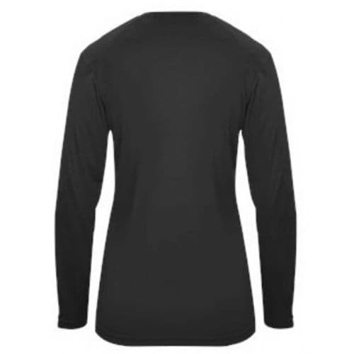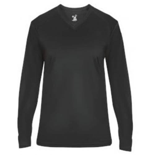 Badger Women's V-Neck L/S Tee 100% Soft Polyester Moisture Management/Antimicrobial Performance Fabric. UVA and UVB sun protection in areas covered by the shirt (UPF 50+). Superior interlock fabric for comfort. Self-fabric collar. Badger sport paneled shoulder. Double-needle hem with tack. Badger heat seal logo on left sleeve.