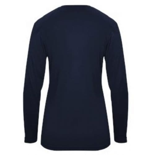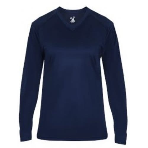 Badger Women's V-Neck L/S Tee 100% Soft Polyester Moisture Management/Antimicrobial Performance Fabric. UVA and UVB sun protection in areas covered by the shirt (UPF 50+). Superior interlock fabric for comfort. Self-fabric collar. Badger sport paneled shoulder. Double-needle hem with tack. Badger heat seal logo on left sleeve.